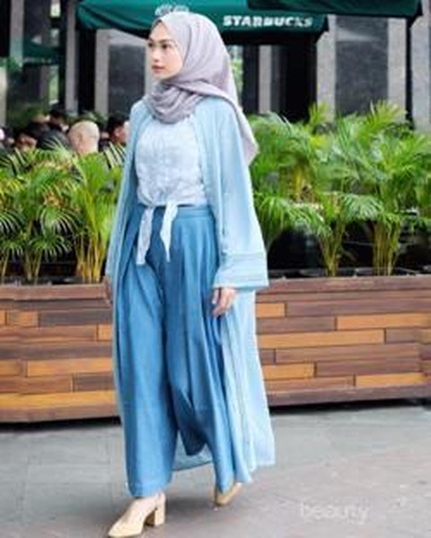 Selanjutnya adalah padu padan warna hijab abu-abu dengan celana kulot denim. Ditambahkan dengan kemeja dan long cardigan yang bernuansa biru, kesan fenimin pasti akan terlihat jelas darimu.