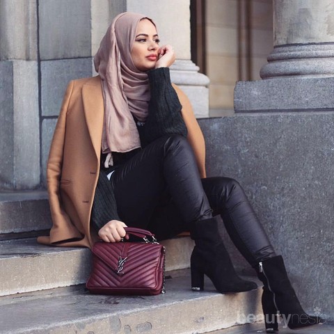 Untuk tampilan formal, selebgram hijab satu ini memilih potongan blazer bernuansa camel. Meski dalam foto ini, blazer tersebut terlihat tidak dikenakan, namun, perpadun warna dalam mix and match busananya sudah memberi kesan edgy. Ditambah tas berwarna merah solid keluaran Yes Saint Laurent!