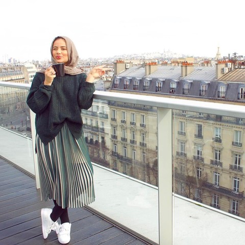 Mengambil gaya stylish dengan rok, Ruba pun memilih detail pleated atau lipit demi memaksimalkan gaya yang cozy. Rok midi bernuansa metallic berpadu chic dengan sweatershirt dark grey. Ia tetap melindungi tengkuk kakinya dengan legging hitam. Setelah itu, statement shoes, yakni sneakers membuatnya tambah stunning!