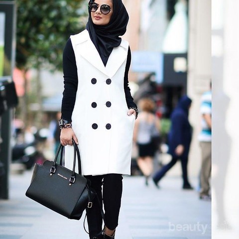 Gaya formal untuk bekerja pun beberapa kali diunggah Ruba pada akun instagramnya. Kali ini, ia memilih button vest tanpa lengan berwarna putih. Konsep monokromatik pun diperjelas dengan innerwear, pants, tas, jilbab serta kacamata hitam yang berlawanan dengan warna putih, yaitu warna hitam yang solid.