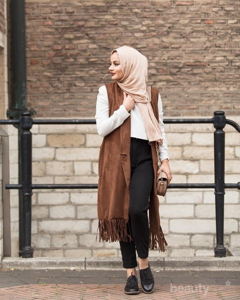 Gaya bohemian mampu diterjemahkan lewat aplikasi vest berdetail fringe atau rumbai di bagian bawah. Vest cokelat ini berukuran midi, untuk itu Ruba mengkombinasikan dengan skinny pants agar terlihat seimbang. Lalu, pilihan oxford shoes membuatnya terlihat futuristik!