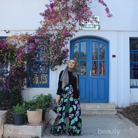 Aplikasi floral bottom atau floral pants juga ternyata digemari oleh Ruba. Bentuk pants yang loose sangat tepat bagi hijabers karena menyembunyikan lekuk kaki. Nah, Ruba pun memadukan bottom ini dengan blouse hitam polos, lalu memilih jilbab pashmina dengan warna soft.