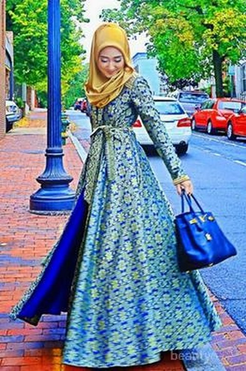 Menggunakan kaftan layer dengan potongan swing-swing akan membuat kamu tampil lebih anggun, lho. Kombinasi warna biru dan coklat yang minimalis akan memberi kesan style yang lebih dewasa tetapi kalem. Cocok untuk kamu yang ingin tampil lebih anggun pada hari raya.