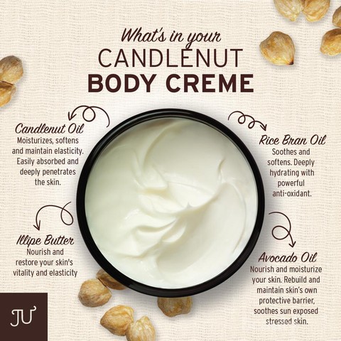 Ada beberapa produk yang perlu kamu coba. Pertama, Candlenut Body. Mengandung Candlenut Oil, Illipe Buter, Rice Bran Oil dan Avocado Oil, produk ini dapat membersihkan dan menghaluskan kulit dalam satu kali aplikasi. Butiran natural shell mengangkat sel-sel kulit mati dengan lembut untuk membuat kulit lebih cerah, memudahkan penyerapan minyak kemiri yang menghaluskan dan melembabkan.