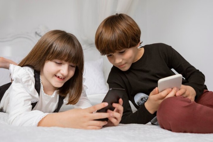 Ilustrasi anak kecil sedang melihat ponsel bersama /Foto: Freepik