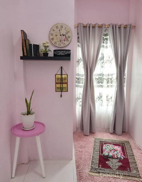 Untuk desain yang paling cantik dengan desain boho chic, mushola seperti ini bisa ditiru, nih. Jangan lupakan rak cantik dan juga karpet yang manis agar suasana mushola lebih menyenangkan.