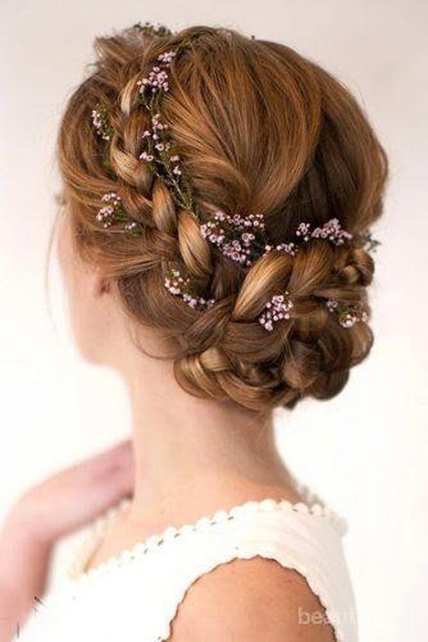 Foto: https://id.pinterest.com/pin/361906520052660805/Gaya rambut selanjutnya yang bisa kam coba adalah braided updo with flowers. Bentuklah kepangan sederhana pada rambutmu, kemudian tambahkan beberapa bunga yang sesuai dengan buket bunga si pengantin. Hasilnya akan menjadi tampilan yang cantik dan romantis yang akan tampak hebat dengan gaun sederhana dan bunga-bunga kecil.