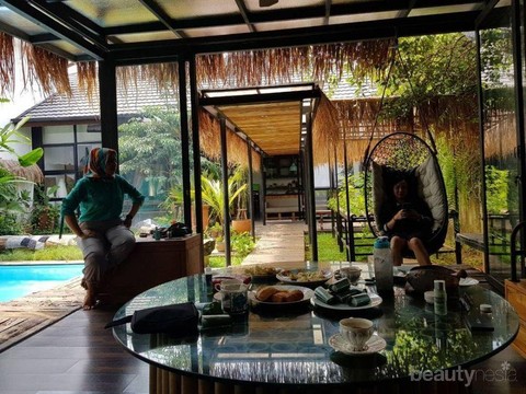 Foto: IstimewaSelanjutnya ini ialah lokasi yang cocok digunakan untuk bersantai. Lokasinya dibuat dekat dengan kolam renang. Atap jerami menjuntai ke bawah semakin membuat suasana asri begitu terasa. Tidak lupa, ada ayunan yang bisa digunakan sebagai tempat bersantai sambil berayun.