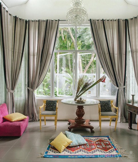 Foto: IstimewaRumah ini juga sangat mengesankan dengan banyaknya unsur matching di dalamnya. Seperti gambar di atas, terlihat tirai dibuat sama warna nya dengan lantai. Warna grey yang sedikit gelap menjadi pilihan untuk menghadirkan kesan adem. Tidak lupa, dua kursi yang terlihat begitu antik dengan bantal blink-blink turut melengkapi.