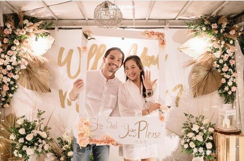 Foto: https://www.instagram.com/abellycMenggunakan tema rustic sebagai dekorasi lamaran, keduanya berdiri berhadapan sambil tersenyum lega sekaligus bahagia.