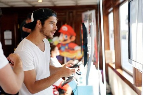 Tyler Posey sedang bermain game Nintendo Super Smash Bros & Mario Kart 8.