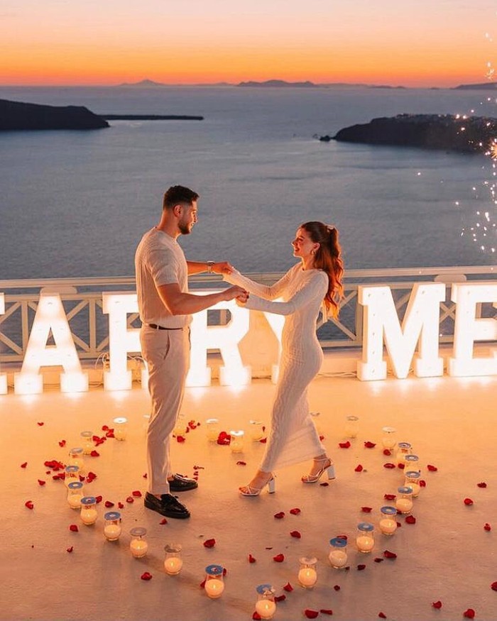 Tak ayal, ada banyak pengunjung yang datang ke tempat ini untuk menikmati liburan romantis hingga melamar sang kekasih. Dengan latar pemandangan laut biru, langit cerah, dan banyak bangunan berwarna putih menghadap kaldera vulkanik sehingga momen lamaran terlihat sangat romantis.