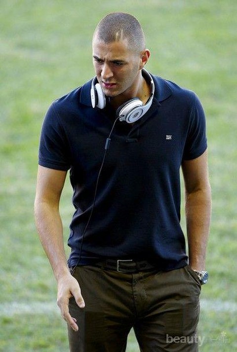 Karim Benzema terlihat keren dengan headset di lehernya ya.