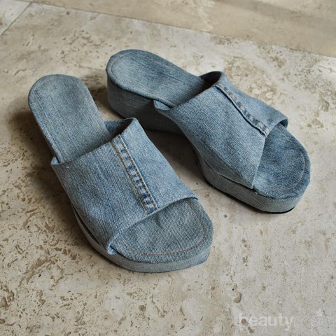 Wedges Minasan yang lapisannya usang, bisa dirubah dengan kain jeans bekas.