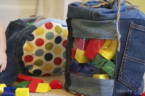 Mainan anak-anak sering dibiarkan berserakan karena kehabisan tempat? Yuk, sulap jeans menjadi wadah mainan untuk anak-anak.
