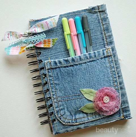 Manfaatkan juga jeans bekas untuk menghiasi bagian depan buku catatan Minasan. Cukup menakjubkan dijadikan pernak-pernik untuk dijual kembali.