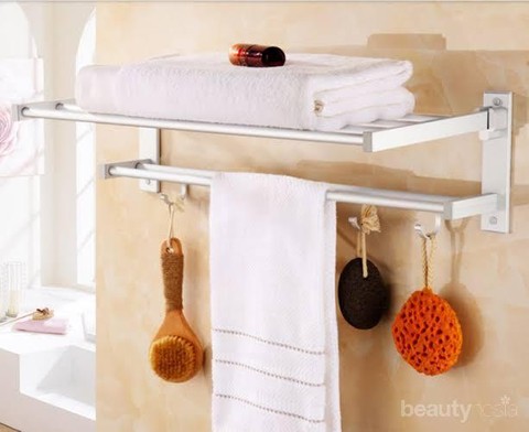 Foto: https://m.tokopedia.com/gstrings/gantungan-handuk-baju-kamar-mandi-rak-wastafel-aluminum-minimalis-unik?trkid=f%3DCa1003L000P0W0S0Sh00Co0Po0Fr0Cb0_src%3Ddirectory_page%3D10_ob%3D24_q%3D_po%3D55_catid%3D1003Selesai mandi, handuk harus dikeringkan agar bisa digunakan lagi. Handuk basah tidak boleh dilipat dan harus digantung agar tidak lembab dan tidak menjadi sarang bakteri. Maka dari itu, kamu perlu menggunakan perlengkapan kamar mandi ini, yaitu gantungan handuk dan baju. Untuk mendapatkan kesan kamar mandi minimalis modern, kamu cukup memilih gantungan baju berwarna hitam atau bermaterial kayu yang tak dilapisi varnish.
