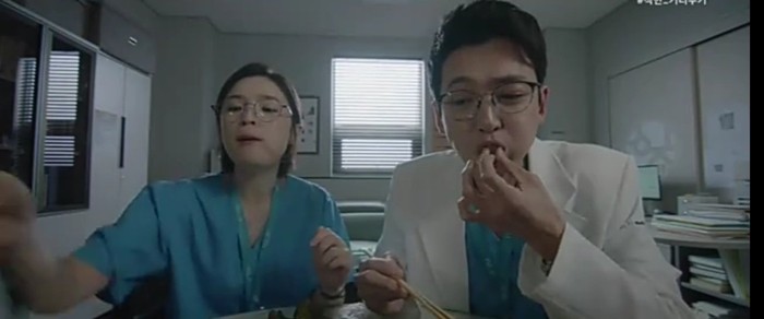 Adegan makan ini menjadi semacam jeda santai dari kesibukan kehidupan rumah sakit Chae Song Hwa kerap terlihat unik saat makan.