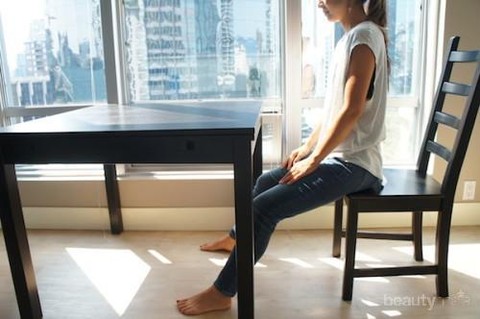 Lepaskan sepatu dan sandal yang kamu pakai dan letakkan di tempat lain. Duduklah di ujung kursi, lalu buka lebar kakimu perlahan-lahan.