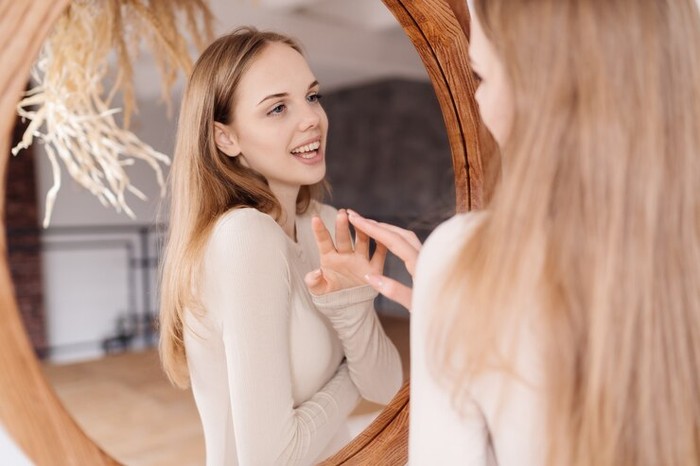 Coba berlatih mengontrol bahasa tubuh di depan cermin. Misalnya, mengatur ekspresi wajah, menyempurnakan senyum, sampai menyesuaikan posisi tangan atau kaki. Amati bagaimana gerakan tersebut memberi arti pada pesan yang disampaikan.Â