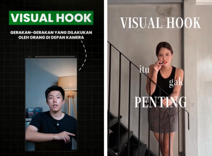 Hook adalah bagian pembuka yang langsung menangkap perhatian penonton. Contohnya video bisa dibuka dengan pertanyaan yang relatable, pernyataan kontroversial, atau masalah yang sering dialami. Kamu juga bisa buat hook dari segi estetika video, Beauties, yakni dengan visual mencolok atau ekspresi kuat.