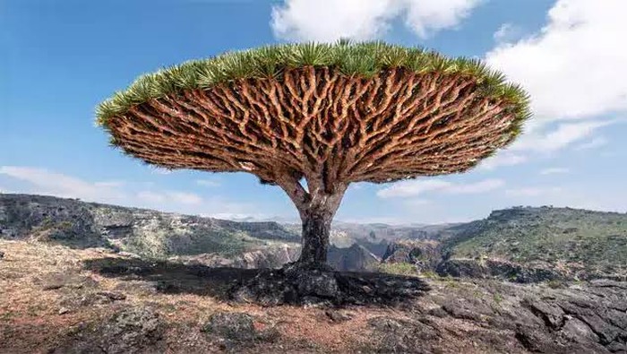 Pohon berbentuk payung ini mengeluarkan getah berwarna merah darah, yang sejak zaman kuno digunakan sebagai pewarna dan obat tradisional. Selain itu, ada juga tanaman seperti Pohon Mentimun Socotra (Dendrosicyos socotranus) yang bentuknya terlihat seperti botol besar.Â