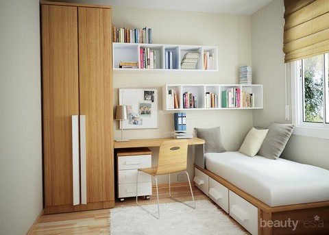 Foto: https://www.dekoruma.com/artikel/35818/desain-kamar-tidur-sederhana-keren-ruangan-sempitDesain kamar ini paling simpel dari desain kamar lainnya, dengan ruangan yang tidak terlalu besar dan tatanan barang yang tidak terlalu banyak sangat pas untuk kamar sederhana minimalis. Dengan unsur kayu yang menjadi furnitur utama, elemen kayu ini juga menggunakan nuansa lembut yang penting untuk menciptakan ruang yang terasa lebih lapang.