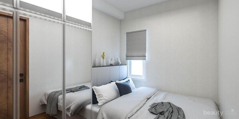 Foto: https://www.sejasa.com/blog/desain-kamar-tidur-minimalis/Ukuran kamar tidur yang sempit sangat tepat menggunakan desain kamar minimalis. Dikarenakan desain minimalis dapat membuat kamar terlihat lebih luas, dengan tembok warna putih dan lemari kaca di beberapa bagian kamar dapat membuat kamar terlihat jauh lebih luas. Pemilihan tempat tidur yang tidak terlalu besar dan bewarna putih akan menambah kesan anggun.