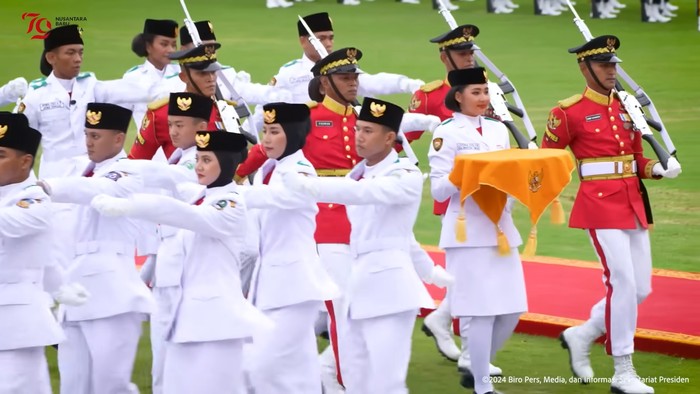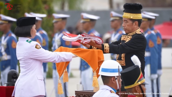 Menariknya, momen ini tidak lagi ada di upacara HUT ke-79 RI di IKN. Sebagai gantinya, Presiden Jokowi turun langsung dari podium menghampiri sang pembawa baki. Selanjutnya, presiden pun memberikan bendera yang ada di dalam kotak kepaada pembawa baki.