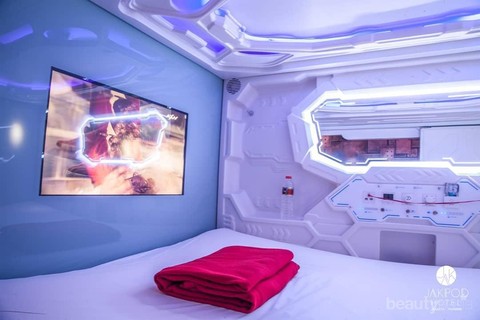 Bosan dengan desain tempat tidur yang itu-itu saja? Bagaimana kalau mencoba tidur dalam kapsul? Nah, Jakpod Hotel ini menawarkan penginapan unik yang berbeda karena memiliki 76 tempat tidur yang di desain futuristik bagi para pengunjung untuk menikmati sensasi tidur di dalam sebuah kapsul yang difasilitasi dengan matras, bantal, selimut, audio TV, headphones, ports USB, dan masih banyak lainnya.