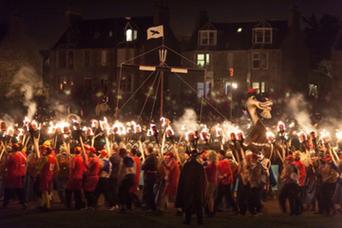 Up Helly Aa adalah perayaan unik di Shetland yang merayakan sejarah Viking. Acara ini mencapai puncaknya saat peserta mengenakan kostum Viking, membakar galon kapal Viking, dan berpartisipasi dalam prosesi malam yang menakjubkan dengan lentera berapi-api.