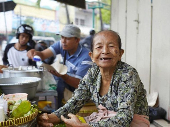 Mbah Satinem berjualan jajanan pasar di depan sebuah ruko. Sebelum ia tiba, orang-orang sudah mengantri menunggunya. Bahkan, karena banyaknya antrian, Mbah Satinem bersama anaknya yang membantu berjualan membuatkan kartu nomor artian agar pembeli tidak berebut.