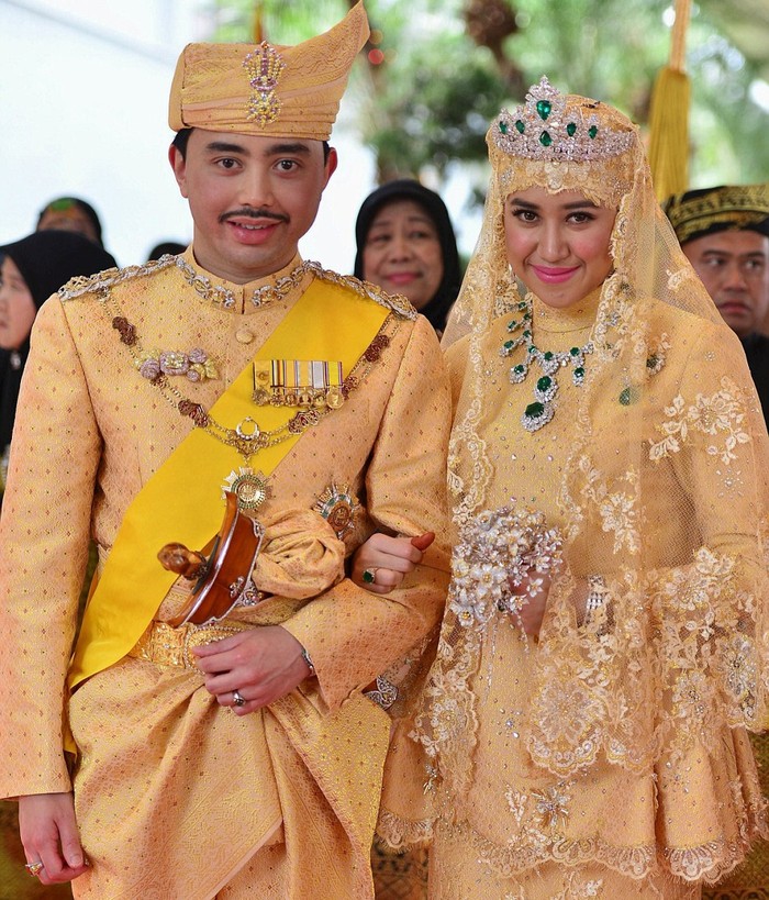 Dalam upacara ‘Bersanding’ atau resepsi pernikahan, kedua mempelai duduk bersebelahan di atas singgasana berlapis emas. Mengutip Irish Independent, pasangan ini tampak serasi dalam balutan pakaian tradisional Melayu berwarna emas yang dilapisi berlian, di mana pengantin perempuan membawa buket permata.