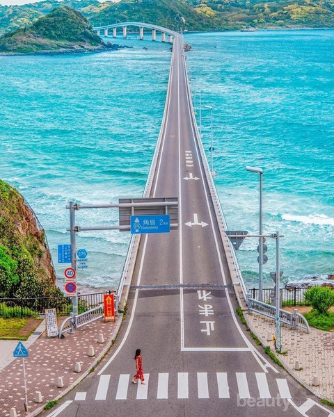 Setelah bersenang-senang di pegunungan bagian utara Jepang, kamu bisa melewati jembatan ternama di Jepang bernama Tsunoshima. Jembatan ini terletak di kota Shimonoseki, Prefektur Yamaguchi.