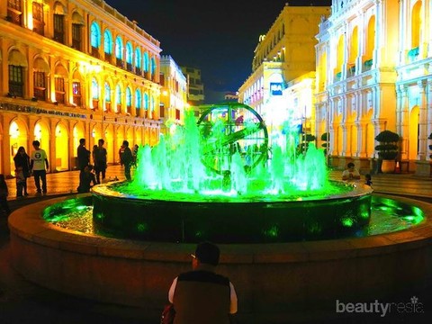Foto: https://www.eatandtravelwithus.com/2014/02/10-things-to-do-in-macau/ Minasan akan disambut dengan air mancur yang saat malam disertai lampu warna-warni.