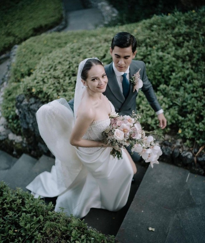 Selanjutnya, keduanya memutuskan untuk menggelar resepsi di Six Senses Uluwatu, Bali pada 26 Mei 2023. Pada kesempatan itu, perempuan 30 tahun itu tampak anggun mengenakan gaun putih berdesain draped column gown serta tudung panjang bersulam karya Monica Ivena.