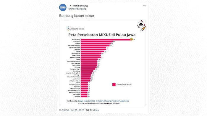Akun TXT dari Bandung juga menyertakan infografis peta penyebaran Mixue di Pulau Jawa. Dari sumber data Google Maps yang berkolaborasi dengan akun Twitter @anggahfdz, ternyata diketahui kota Bandung mendominasi gerai Mixue sebanyak 77 gerai dibanding kota lainnya.