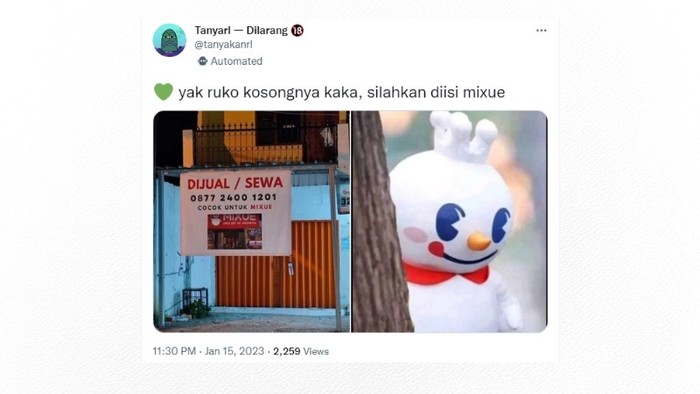 Berhubungan dengan ruko yang kosong, akun Twitter Handoko Tjung @handokotjung menuliskan tweet yang juga kocak! Ia mengatakan bahwa hati yang kelamaan kosong, bisa-bisa berubah menjadi kios Mixue. Hati Beauties kosong, nggak nih?
