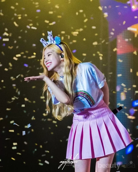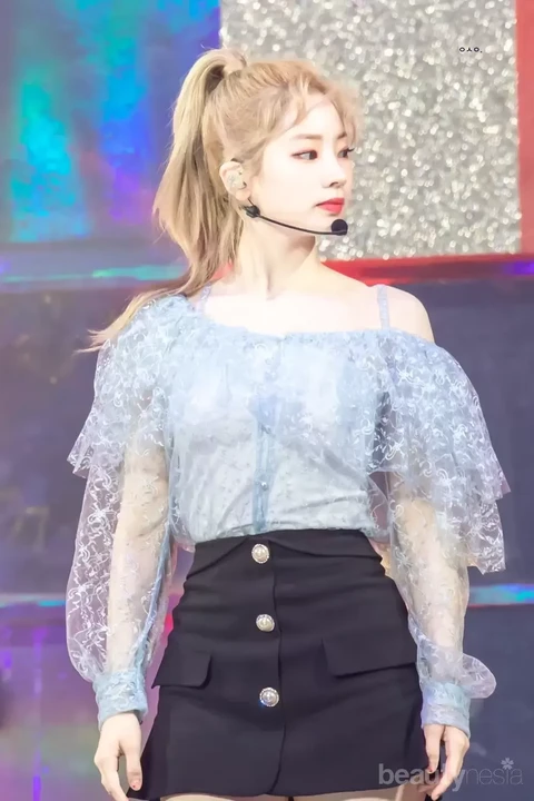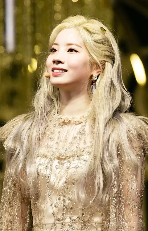 Foto: https://www.koreaboo.com/Dahyun mengenakan outfit berwarna biru dan terlihat cantik dengan riasan ringan dan rambut pirang. Ia bersinar di atas panggung seperti biasa. Setuju?