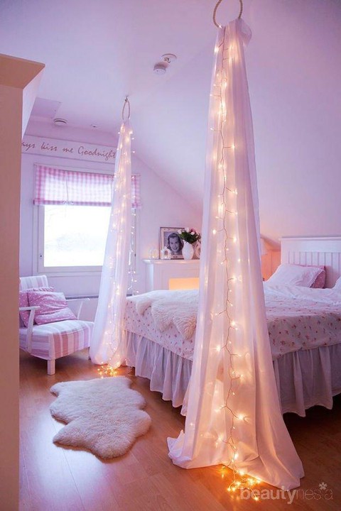 Foto: https://viral.dafunda.com/desain-kamar-kost-menarik-dan-rapi/Selanjutnya, kamu bisa memberikan sentuhan yang mewah terhadap kamar kost kamar yang sempit. Caranya cukup simpel dan sederhana. Cukup dengan menggunakan 2 kain panjang putih yang terbuat dari bahan seperti renda, kemudian tambahkan aksesori berupa lampu tumblr. Tataan ruang lainnya kamu bisa menyesuaikan dengan kebutuhan. Agar terasa lebih menyenangkan, gunakanlah warna favorit agar mood kamu selalu bagus.