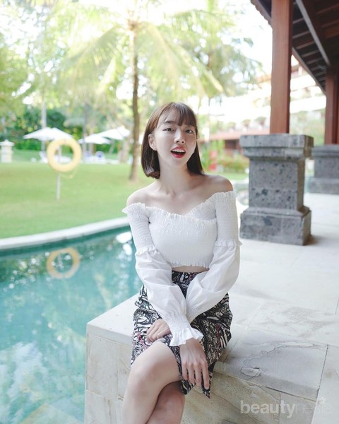Dengan top off shoulder berwarna putih, Sunny memadupadankan dengan rok bermotif batik khas Indonesia. Bagus banget ya? Kulitnya yang putih susu juga membuat Sunny terlihat bersinar dan cerah. Wah, patut dicontoh nih Ladies.