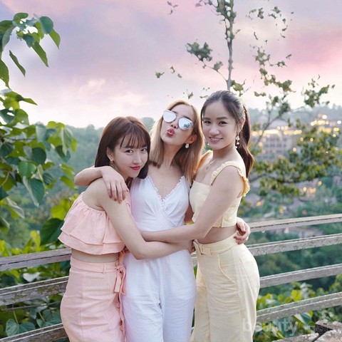 Sunny tidak sendiri saat liburan di pulau Dewata beberapa waktu lalu. Selain bersama keluarga, wanita berambut pendek ini juga asyik berlibur bersama sahabat-sahabatnya dari Korea. Sunny mengenakan one set kekinian dengan warna peach senada. Bagian atasannya dia memilih blouse aksen ruffle tanpa lengan dengan bawahan pants lengkap dengan ikat pinggang.