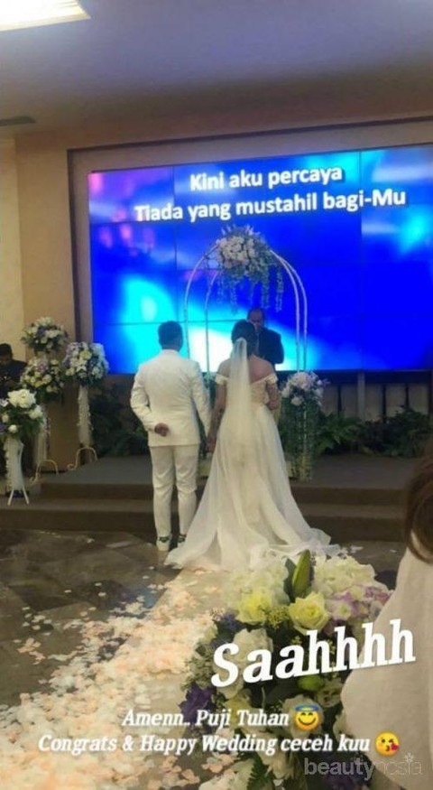 Resmi diikat tali pernikahan, keduanya menjalani pemberkatan di gereja. Momen ini berlangsung sakral dan syahdu dengan taburan kelopak bunga mawar putih yang mengiringi langkah Sheila Marcia menuju altar pernikahan.