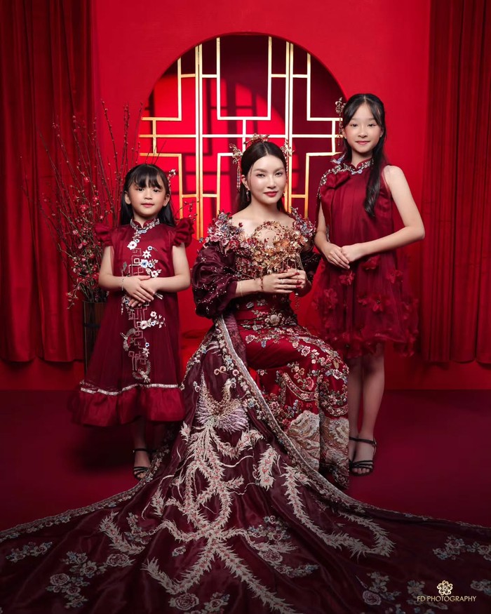 Lewat fashion stylist, Belly Iverzon, Sarwendah terlihat anggun bak artis drama Cina dengan Majestic dress bersama kedua putrinya. Thania dan Thalia bak anak kembar yang mengenakan gaun merah border bunga dengan siluet berbeda.