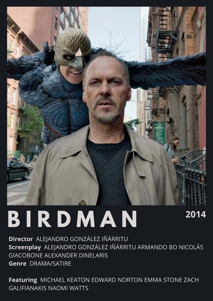 Birdman memenangi empat Oscar, salah satunya sebagai film terbaik di tahun itu. Selain Emma Stone, film ini juga dibintangi oleh Michael Keaton, Naomi Watts, Edward Norton, dan Zach Galifianakis.