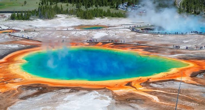 Pernah lihat mata air panas yang warnanya seperti pelangi? Itulah Grand Prismatic Spring! Mata air panas terbesar di Amerika Serikat dengan diameter sekitar 112 meter ini punya gradasi warna biru, hijau, kuning, hingga oranye dan merah di tepiannya. Warna-warna yang menyala ini terbentuk secara alami berkat jutaan mikroorganisme yang hidup di suhu air yang berbeda-beda.Â