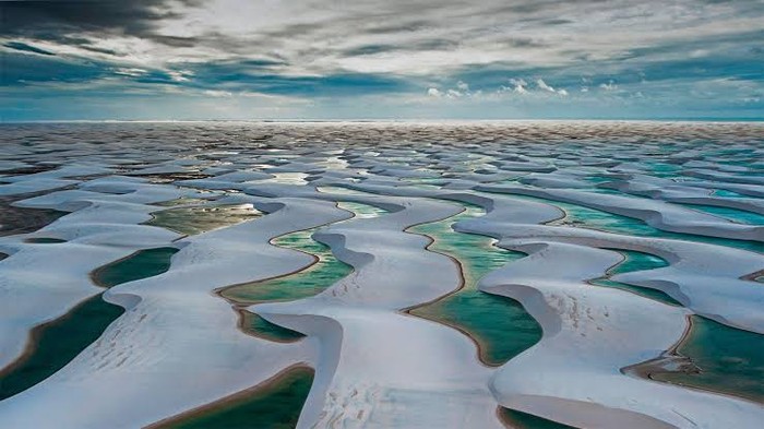 Taman Nasional Lencois Maranhenses menampilkan hamparan bukit pasir putih yang menawan. Keunikan tempat ini terletak pada kolam-kolam air tawar berwarna biru kehijauan yang jernih, yang terbentuk dan menghilang secara musiman.Â