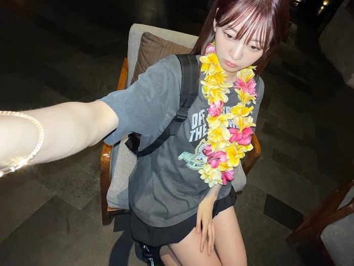 Dalam potret yang diunggah pada Sabtu, (17/5/2025), Cho Yi Hyun tampak antusias menantikan waktu makan malam di penginapan dengan mengenakan kalung bunga khas Bali.