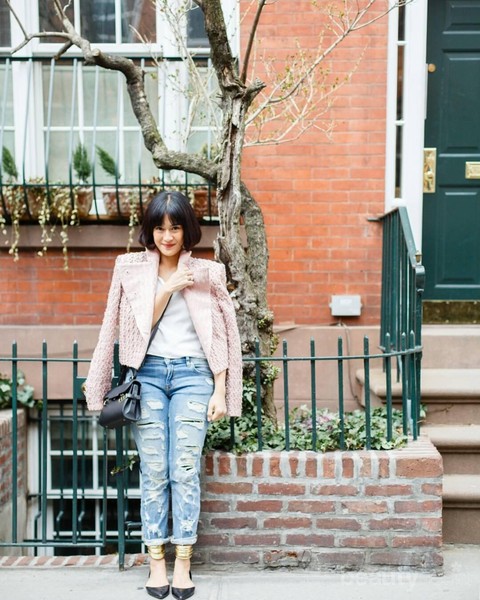 Pengen tampil casual namun tetap terlihat feminim? Gaya fashion seleb Indonesia satu ini bisa kamu contoh. Kamu bisa memadukan ripped jeans kesayanganmu dengan white top dan juga jaket. Nah, untuk menonjolkan sisi feminimmu, pilihlah jaket dengan warna-warna pastel seperti yang Dian Sastro kenakan ini. Manis bukan warnanya?