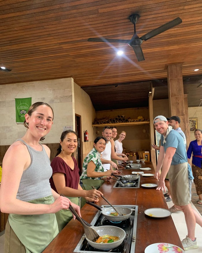 Ubud Cooking Class Bali with Balinese Chef menjadi aktivitas populer yang direkomendasikan para traveler. Cooking class yang menawarkan pengalaman belajar memasak hidangan autentik Bali atau Indonesia dari koki lokal atau ibu rumah tangga di sana, Beauties. Kelas ini biasanya dimulai dengan kunjungan ke pasar tradisional untuk membeli bahan segar di pagi hari, kemudian belajar membuat bumbu, lalu memasak. Beberapa menu yang biasanya dibuat mulai dari vegetarian, non vegetarian, dan dessert, seperti saus kacang, bumbu Bali, mie goreng, ayam bumbu Bali, sate ayam saus kacang, hingga kolak pisang.
